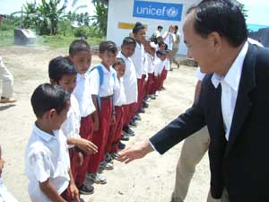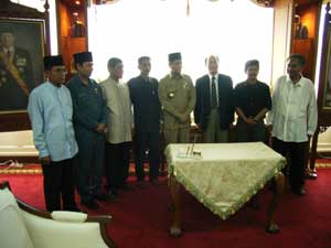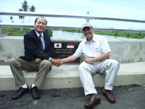 海老原大使のアチェ・メダン出張   海老原紳駐インドネシア日本国大使は、10月3−5日の間、アチェとメダンを訪問しました。    3日に訪れた、アチェ州では州知事公邸で行われた日本政府の草の根・人間の安全保障無償資金協力4案件(ピディ県のコミュニティ復興支援関連事業)の署名式に出席し、ムスタファ・アブバカル・アチェ州知事代行やユスニ・サビ・アチェ和平社会復帰庁(BRA)代表、アブドゥラ・ヤフヤ・ピディ県知事らの同席の下、4団体との署名を交わしました。また、この日には、アチェの復興支援に尽力する国連機関やNGOで活動する日本人の方々との間で有益な意見交換を行いました。    続いて4日には、アチェ西海岸道路130キロメートルのうち、チャラン〜テノム間約33キロメートルの開通式に出席し、クントロ・マンクスブロト・アチェ・ニアス復興庁長官、ムスタファ・アブバカル・アチェ州知事代行、バスリ・エムカ・アチェ・ジャヤ県知事らと道路の開通を祝いました。式典の中でクントロ長官からは「アチェ・ニアスの津波復興プログラムのうち、最大のプロジェクトであるチャラン〜ムラボー間の西海岸道路は、今日、チャラン〜テノム間の33kmが開通し、12月には残りのテノム〜ムラボー間の90kmが開通する予定である。この事業は、我々の友人である日本が支援してくれた。チャラン市民及びアチェ市民を代表して、日本政府、総理大臣、外務大臣、日本の国民の皆さんに対して、心からお礼を申し上げる。これほど大きな修復事業を手がけた日本の支援は大変な貢献である。」と日本への感謝の気持ちが述べられました。大使は、クントロ長官と一緒に日本の支援により修復された橋のたもとで記念撮影をしました。アチェの西海岸道路は、アチェの復興活動及び市民の経済活動を支える重要な幹線道路であり、チャラン〜ムラボー間の道路の開通が、今後の安定したアチェの復興に寄与することが望まれています。    北スマトラ州メダンでは、邦人との意見交換の他、最終日の5日には同市内の日本人慰霊碑に献花したほか、メダン市内の円借款による「メダン洪水防御プロジェクト」の現場を視察し、草の根・人間の安全保障無償資金協力で校舎を建設したタマン・シスワ中学校を訪問しました。同校では海老原大使の来訪を記念した植樹が行われました。