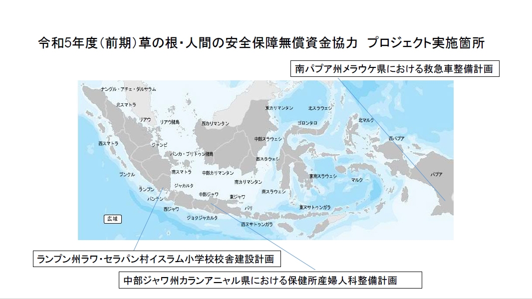 | 1. | 中部ジャワ州カランアニャル県における保健所産婦人科整備計画 | ジャリン・ヌサ財団 | 保健 | 中部ジャワ州カランアニャル県ケバックラマット郡カリウル村 | IDR 985,161,000/ ¥9,081,867 / US$66,291 | 本事業は、同県内の保健所に対して、新たに1階建ての産婦人科棟1棟を建設することで、同県内のみならず他の県から来院する患者の母子保険医療サービスに関する利用改善を図り、もって同地域の医療サービスへのアクセスと質の改善に寄与する。 |