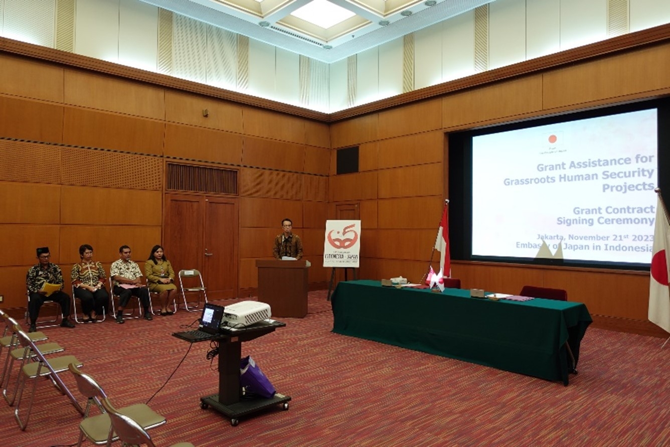 11月21日、当館において、令和5年度前期草の根・人間の安全保障無償資金協力案件として「中部ジャワ州カランアニャル県における保健所産婦人科整備計画」、「南パプア州メラウケ県における救急車整備計画」及び「ランプン州ラワ・セラパン村イスラム小学校校舎建設計画」の贈与契約署名式を開催し、金杉憲治駐インドネシア日本国大使が被供与団体代表との間で贈与契約を締結しました。
