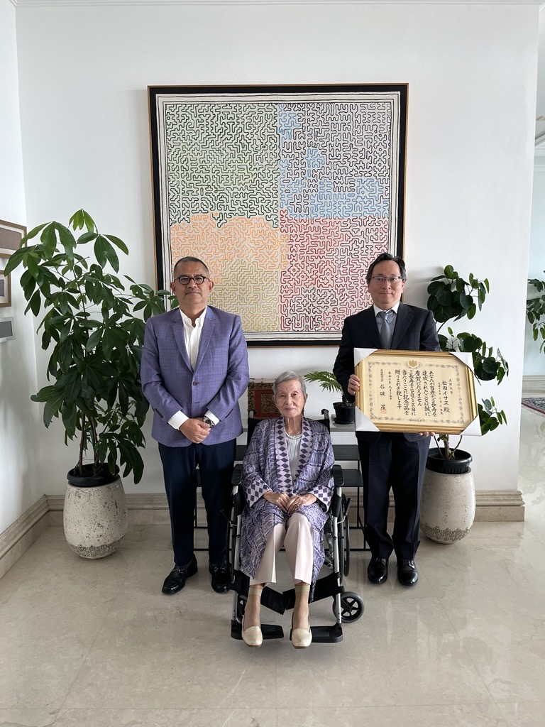 令和7年度百歳以上高齢者-松田イサヱ氏への表彰状授与 令和7年11月13日 [Bahasa Indonesia] 11月12日、明珍臨時代理大使は、令和7年度百歳以上高齢者である松田イサヱ氏のご自宅を訪問し、祝状及び記念品の授与を行いました。 同氏は、在インドネシアペルー大使ルイス・ツボヤマ氏の叔母に当たる方でもあり、同大使も授与に参加されました。 ますますのご長寿をお祈りいたします。